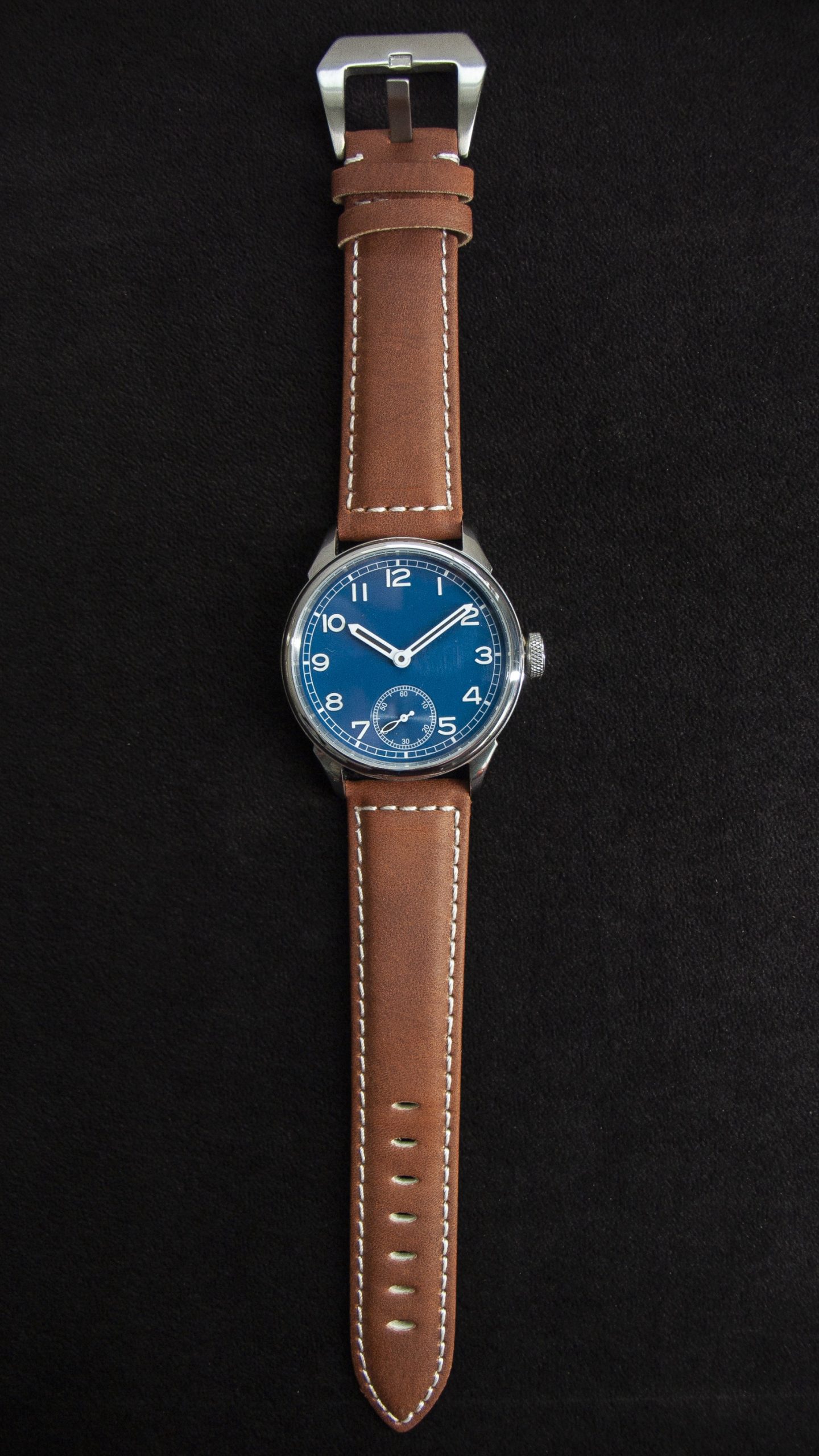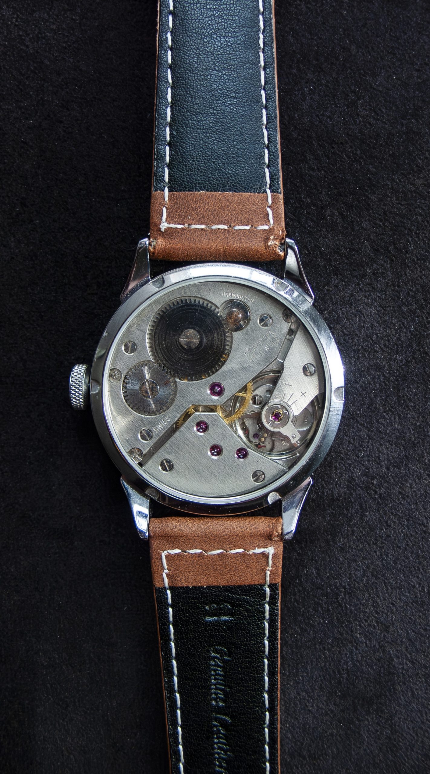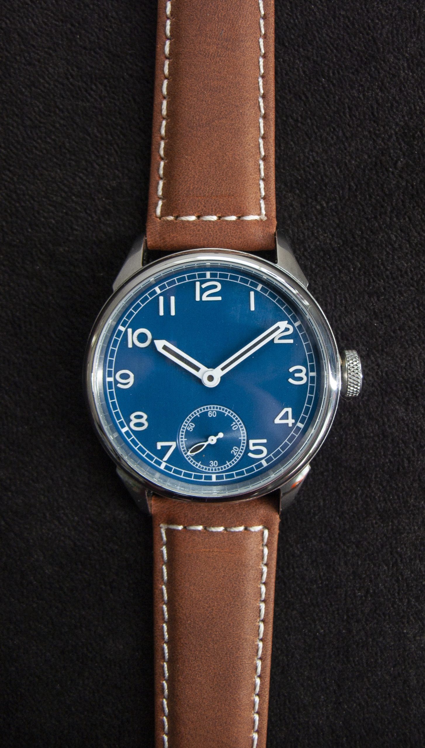 Classically styled mechanical watch equipped with a genuine Swiss made Unitas/ETA 6498 movement, finished off with a brown suede leather strap.
